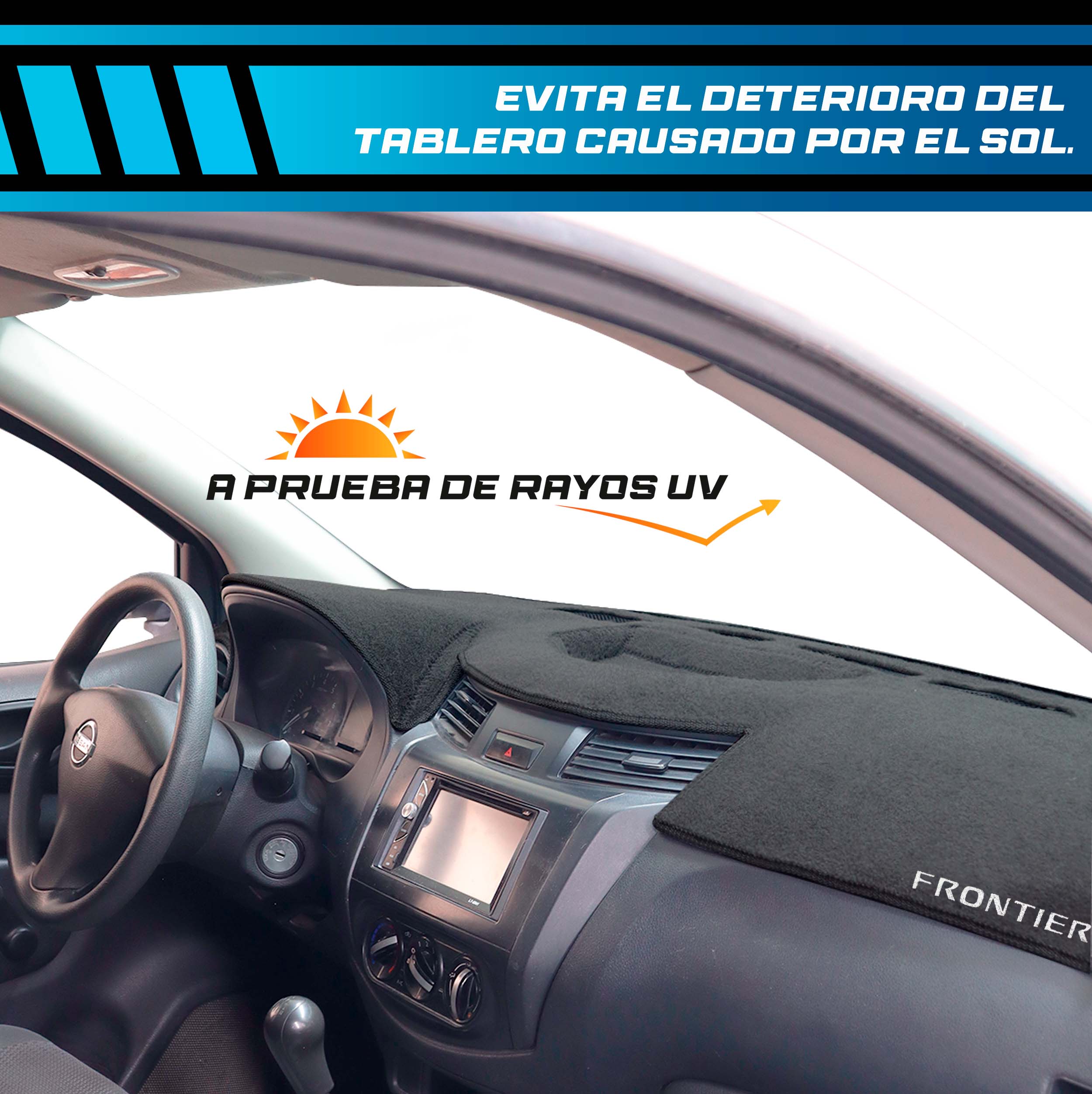Fabricado con alfombra 100% automotriz de alta calidad, este cubre tablero para NISSAN FRONTIER (SIN ABERTURA PARA ENCENDEDOR) se amolda a la forma original de tu vehículo, ofreciendo un ajuste preciso y un acabado profesional.